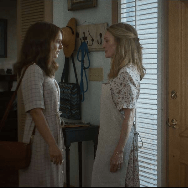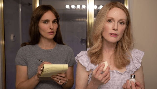 Lo que nos intriga todavía más del personaje de Elizabeth es que es interpretado por Natalie Portman. Sabemos que hay un guión, que hay cámaras y que Hayness está detrás, pero es inevitable preguntarse si las respuestas o el proceso para prepararse para un rol será similar en el caso de Portman. Verse en el espejo para imitar y perfeccionar los movimientos de su papel, ponerse en la piel del personaje, como lo hizo en El cisne negro de Darren Aronofsky. Ambas actuaciones, la de Portman y la de Moore se entrelazan a lo largo de la cinta y comenzamos a ver cómo Elizabeth se mimentiza con Gracie. El mundo de ambas se mezcla en los espacios, en las personas y en las expresiones. De este modo, el director hace un guiño a cómo los actores se obsesionan con la idea de interpretar meticulosamente a un personaje. La expectativa de volverse otro contra el hecho de no serlo. “I want you to feel seen”, le dice Elizabeth a Gracie.